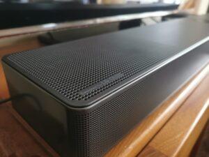 Pour le design, la LG SC9S reste fidèle à l’ADN de la marque, à savoir une barre de son d’apparence solide avec une sobre finition en aluminium qui met en valeur les grilles métalliques à chaque extrémité et au centre.